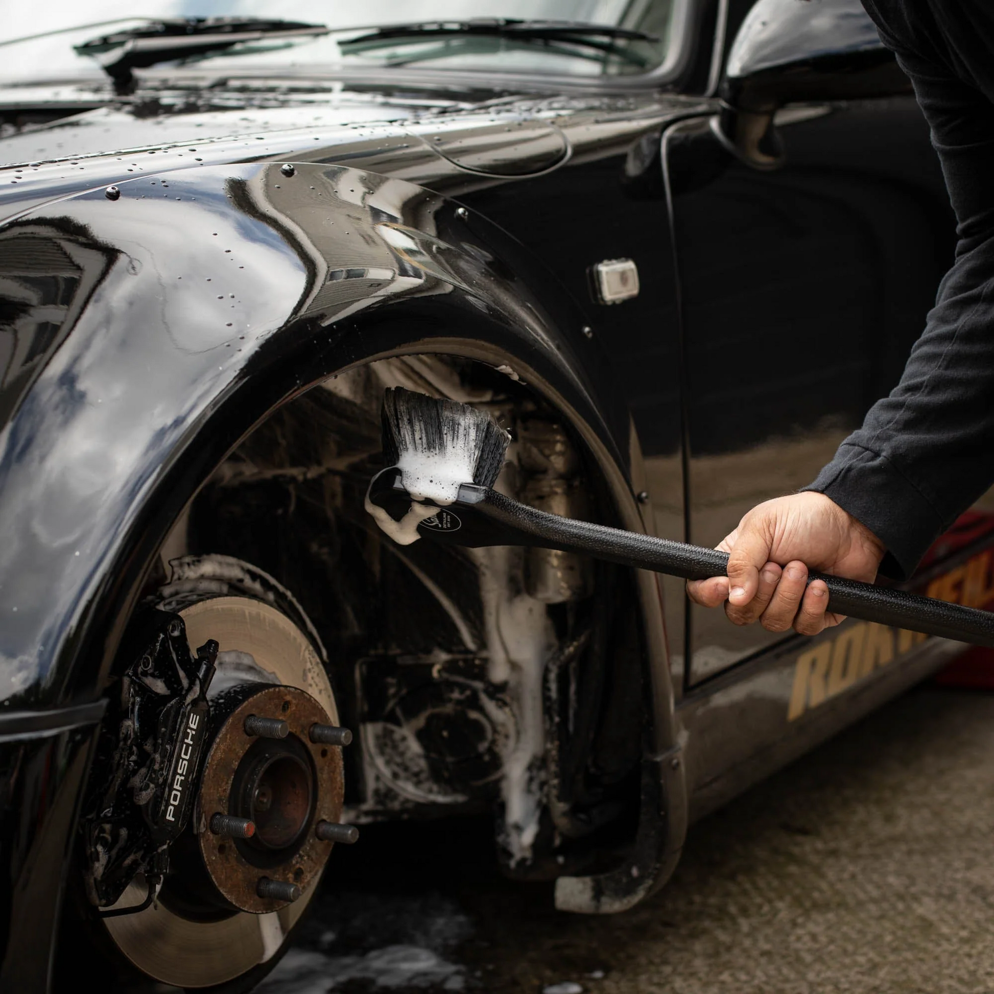 A long handled wheel arch brush, ideal for removing ingrained grit and dirt embedded within your wheel arch liners.